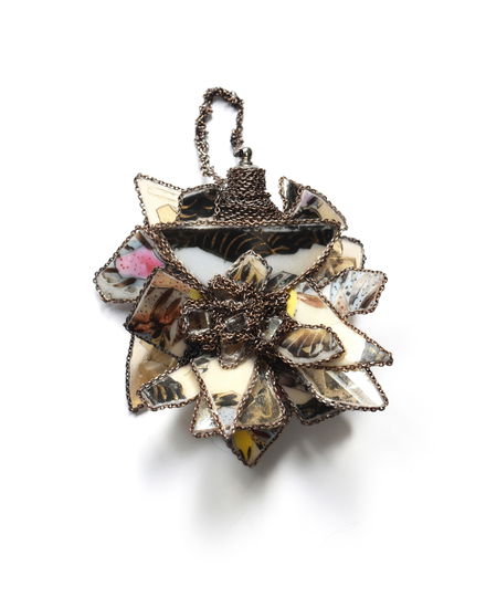 Materials: Porcelain pieces from a Japanese cup and saucer, patinated silver chain, glass fragments from a wine glass, perfume vial with screw top, fixing agent, stainless steel