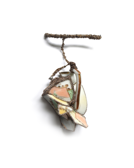 Materials: Porcelain pieces from a Japanese cup, silver, patinated silver chain, glass perfume vial with screw top, fixing agent, stainless steel