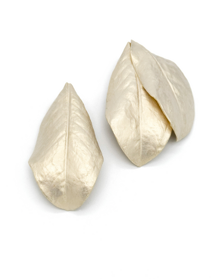 Warm silver, feather-light, alive with texture — a memory. From the series Magnolias of Istanbul, Burcu Sulek transforms real magnolia leaves into ethereal papier-mâché earrings — each piece a quiet act of resistance and remembrance. of nature transformed into wearable poetry.
