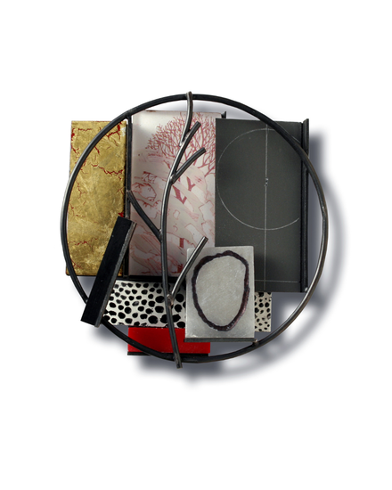 Materials: Oxidized nickel silver, enamel on steel, gold leaf, plastic, paper, alabaster, acrylic painting