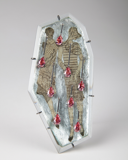 Materials: Silver, paper, silver leaf, syntetic gemstones, resin