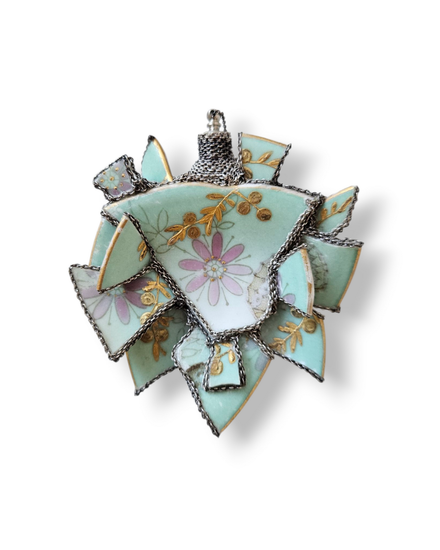 Materials: Porcelain pieces from a Fischer & Mieg saucer, silver, patinated silver chain, glass perfume vial with screw top, fixing agent, stainless steel